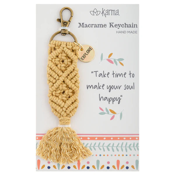 Personalize wallets, keys, or your favorite bag with one of our hand crafted macrame keychains. Each one comes with a unique gold metal word charm and is a wonderful gift option for mothers, sisters, friends, or anyone special in your life. Add some boho into your life with charming accessory!