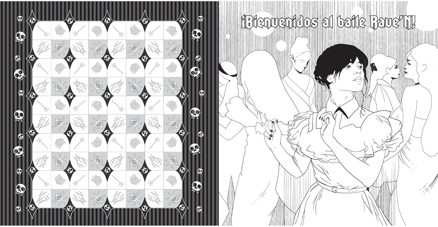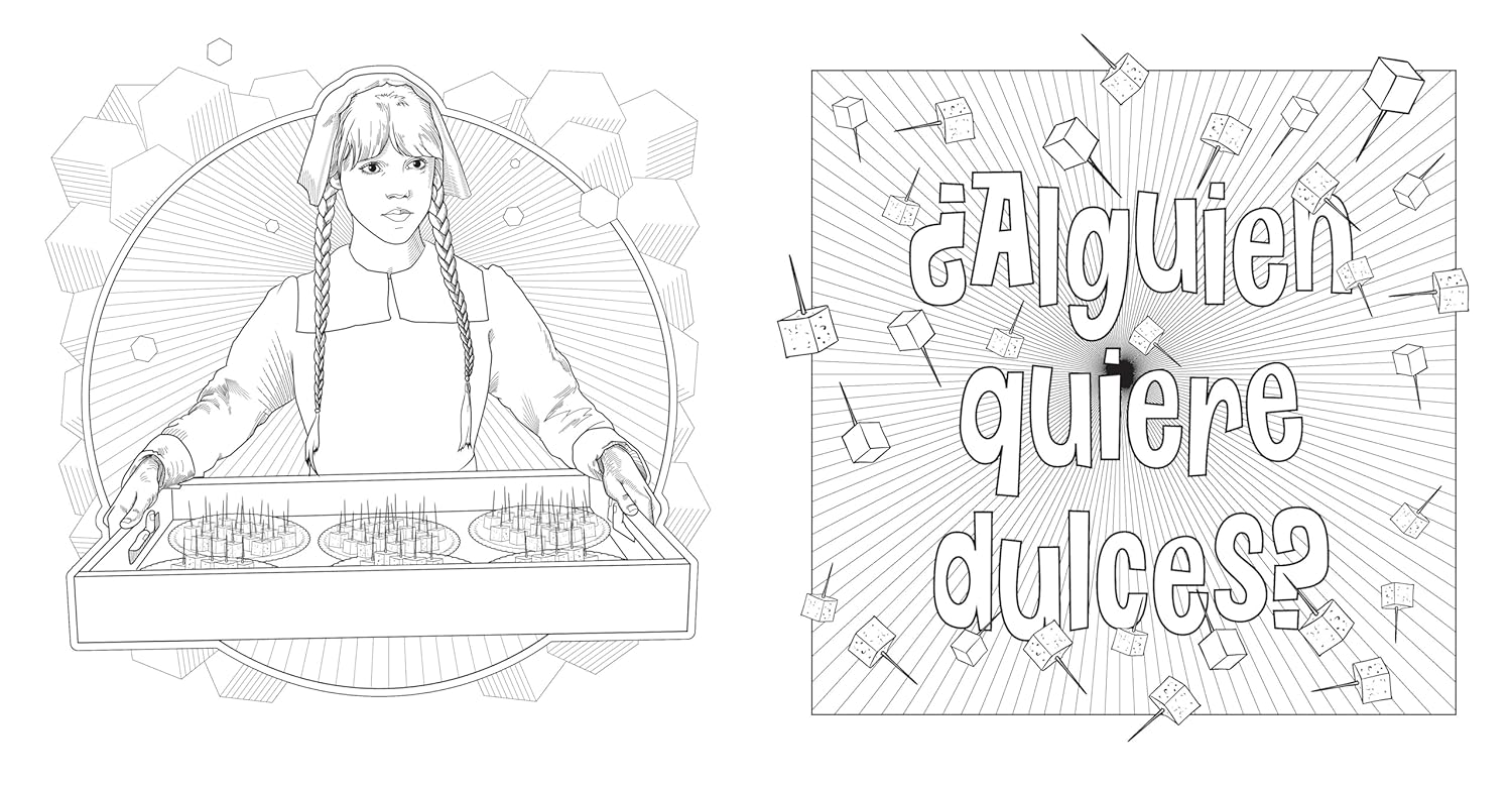 Si Miércoles Addams pudiera elegir las tonalidades con las que pintaría estas páginas, seguro que serían todas negras, ¡pero tú puedes darles vida como quieras!