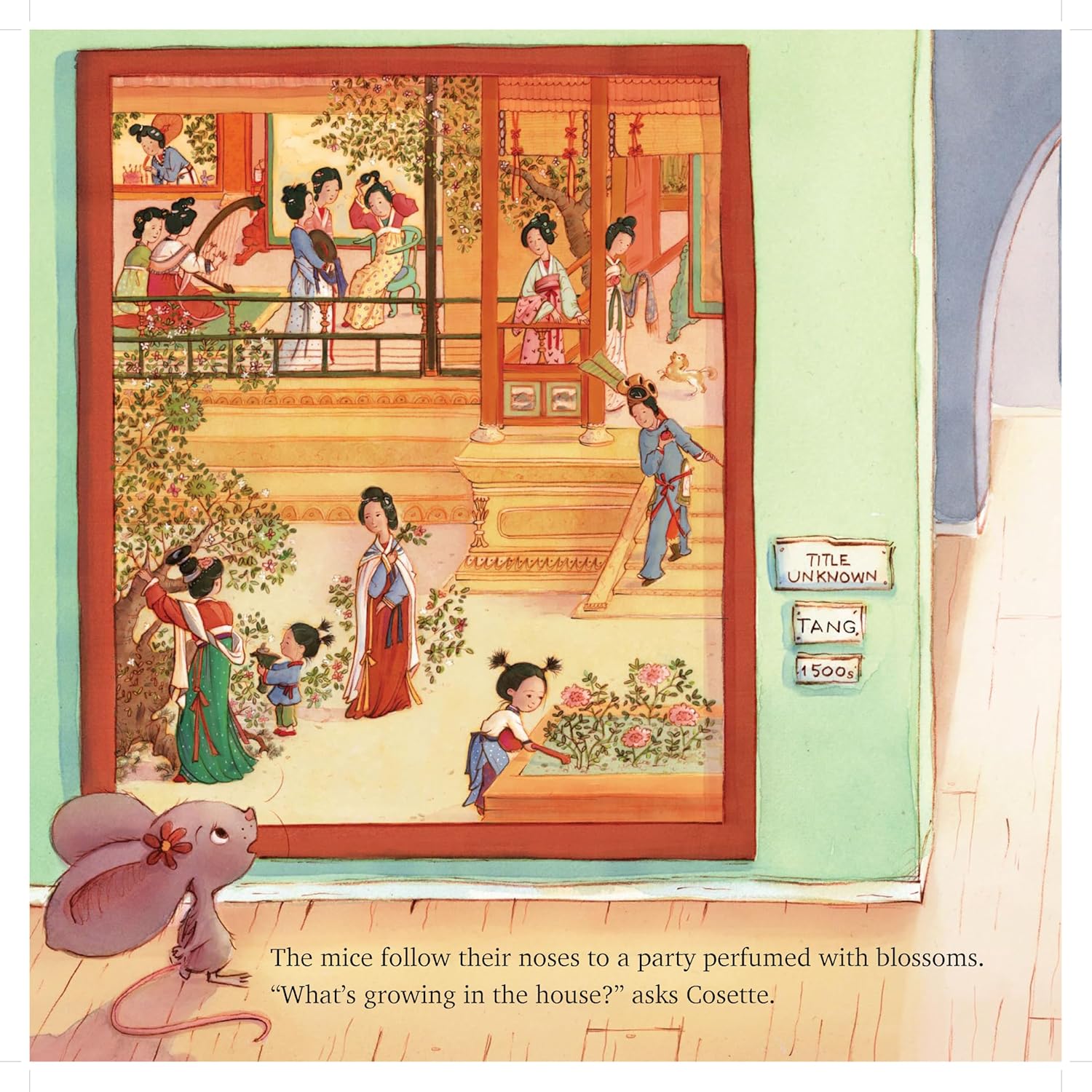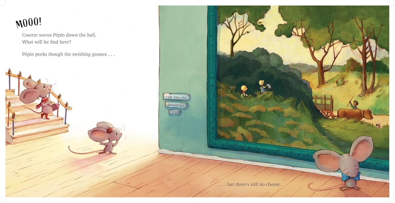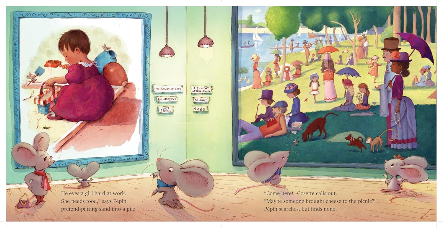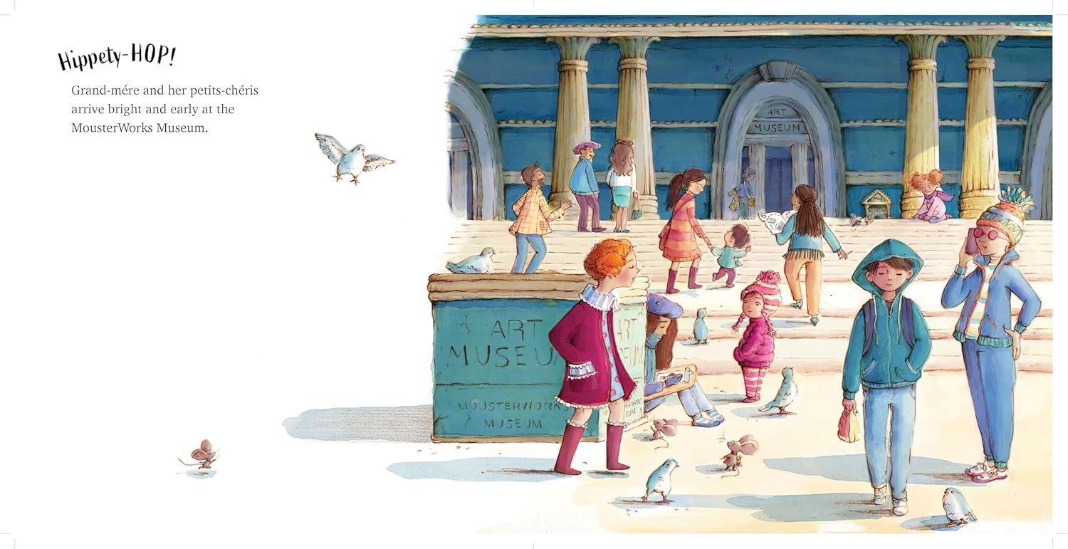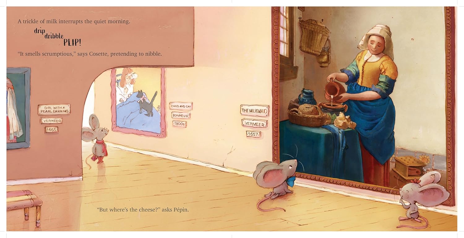 When young mice, Cosette and Pepin, join their Grand-mere on a visit to a mouse-sized museum, they cannot help but notice details, ask questions, and think creatively. As they move from gallery to gallery featuring the MOUSTERWORKS of famous master artists, their senses are awakened to spark their imaginations. From the dribble, dribble of milk splashing out of a pail to the pitter pat of toddeling feet on a stone floor, Cosette and Pepin are inspired to create their own mouster-pieces, using items and events found in their everyday lives, including a hunk of delicious cheese!